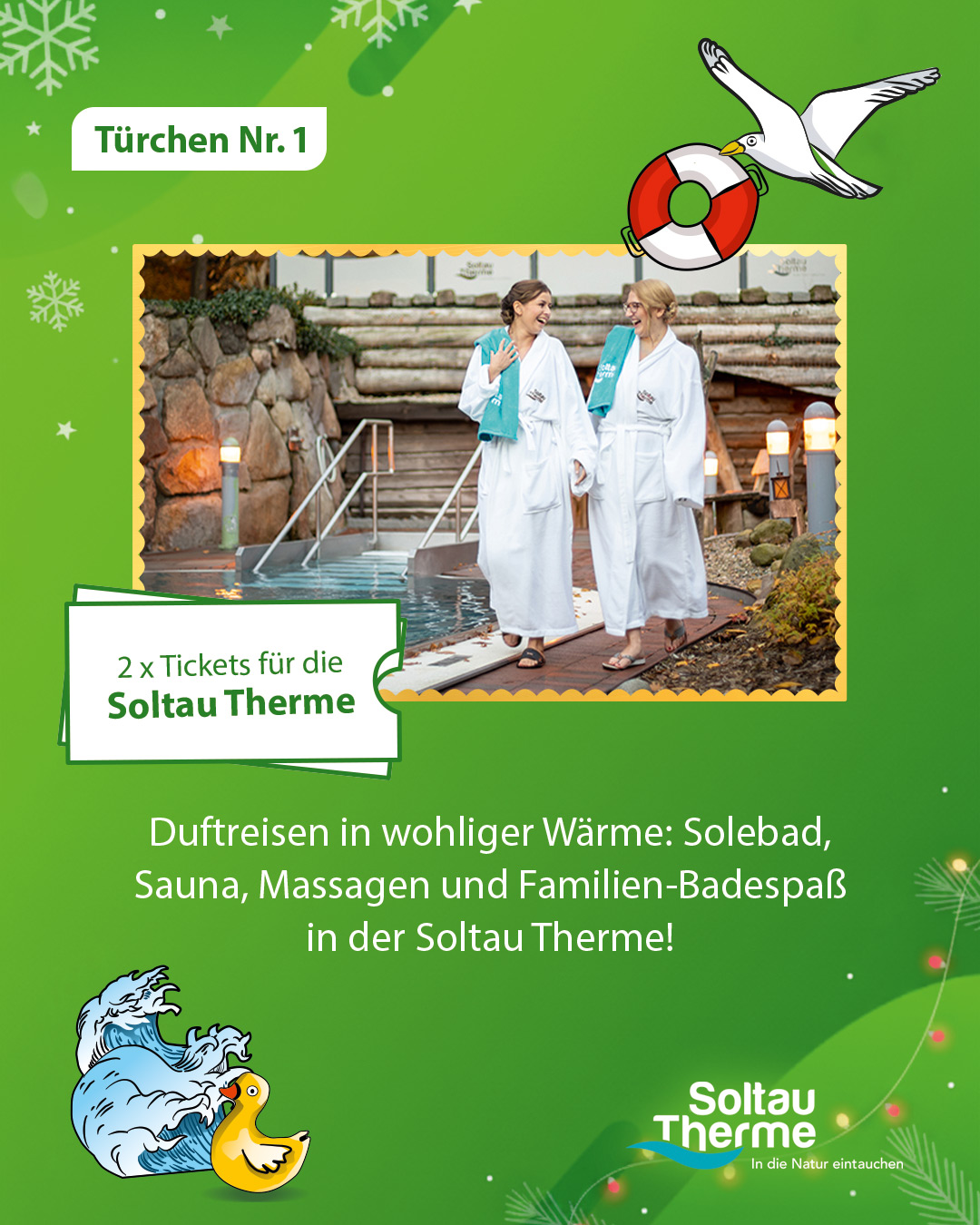 Alle an Bord, wir fahren zum Nordpol! Der Weg dorthin ist in 24 Stopps unterteilt. Ab dem 1. Dezember öffnet sich jeden Tag ein Zugtürchen, hinter dem sich ein anderes festliches Gewinnspiel versteckt. Es erwarten dich abgefahrene Preise wie ein Fallschirmsprung in Hildesheim, Freikarten zum Heide Park Soltau, Eintritt zu diversen Thermen, ein Deutschland-Ticket und vieles mehr!
